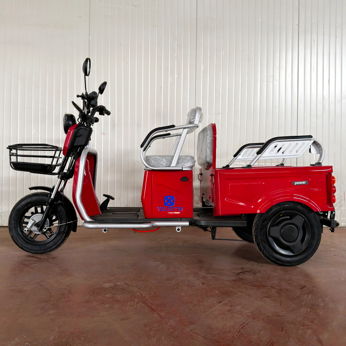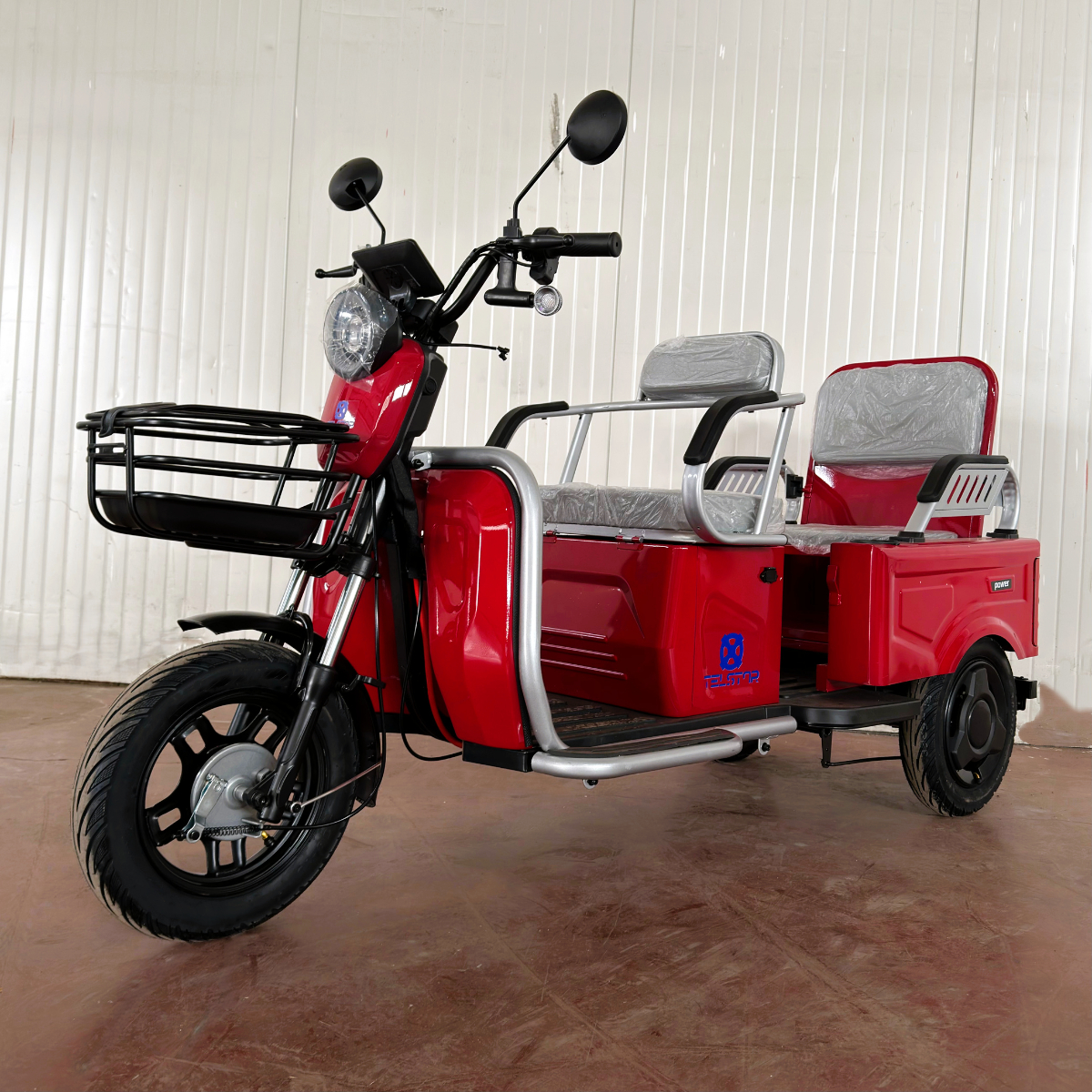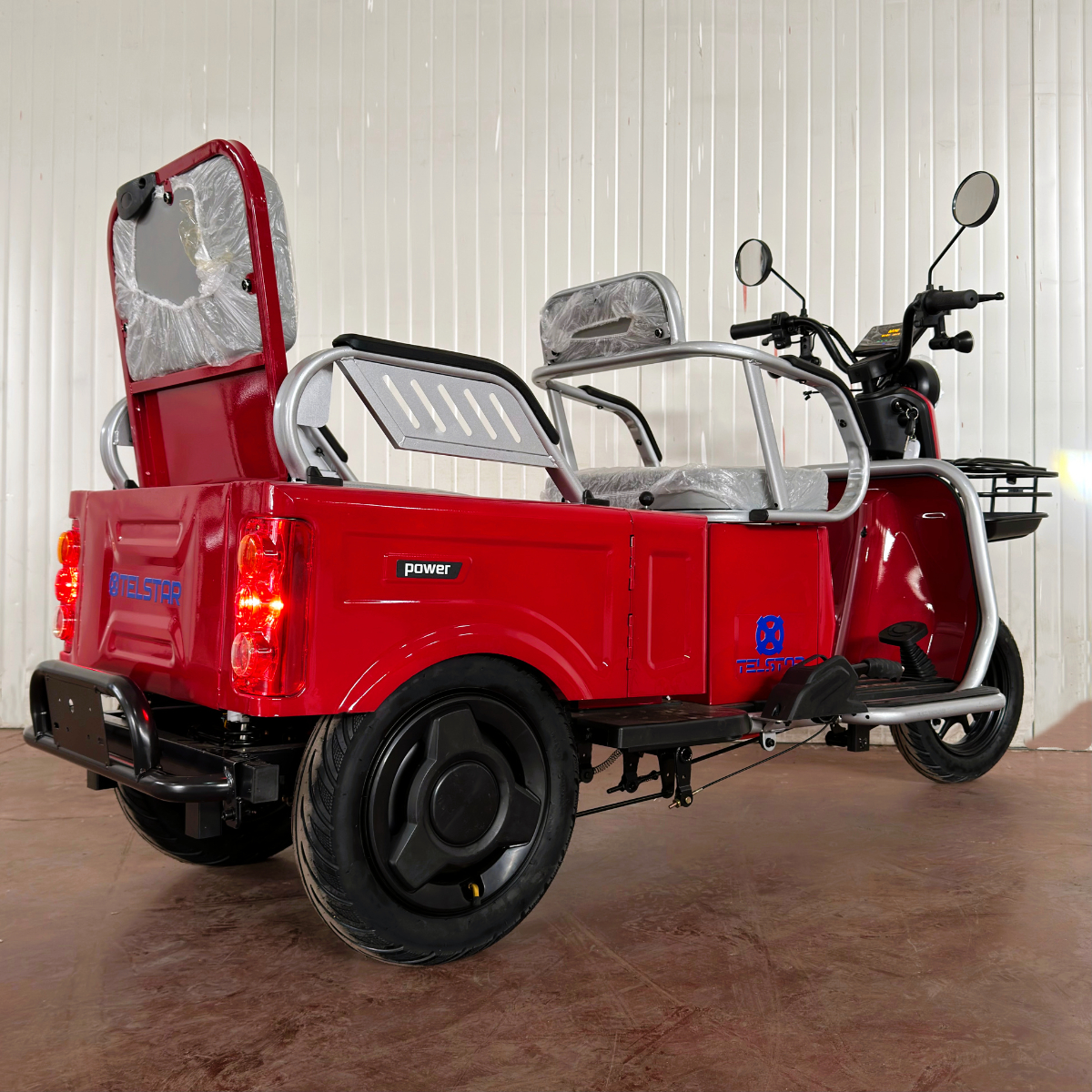 Оригинална електрическа триколка- две места + карго отделение с изключително висококачествена изработка. Задната седалка се превръща в удобно карго багажно отделение с 1 движение. Прахово нанасяне на боята по електролитна технология. Триколката се предлага и във вариант със лесна за монтаж и демонтаж покривна конструкция.