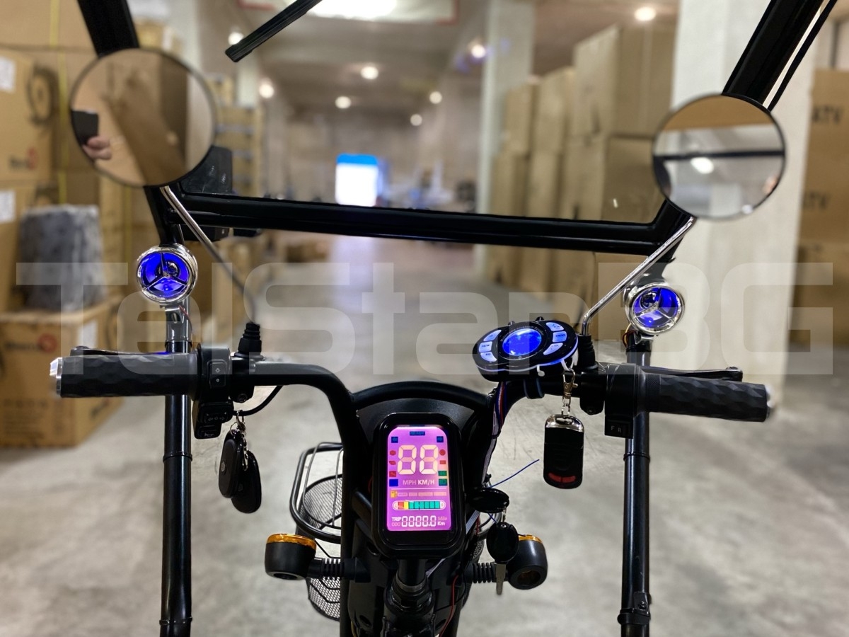 Допълнителна информация​задно предаване, с диференциал - брой места: 3 - местна ,спирачна система: 1 крачна и 3 ръчни спирачки за по-удобно спиране - 3 скорости + задна скорост - аварийни светлини - ГОЛЯМ дигитален LCD дисплей - странични светлоотразители - пълна светлинна окомплектовка ( преден LED фар тип ЛУПА , мигачи- предни, задни, стопове, габарити) - задната седалка се преобръща и се превръща в голямо карго отделение - клаксон - метална кошница за багаж отпред - Подарък- 2 бр. огледала за задно виждане + 2бр. дистанционни с аларма и безконтактно включване + предна пазарска кошница за пазаруване + ГОЛЯМА задна пазарска кошница за пазаруване
