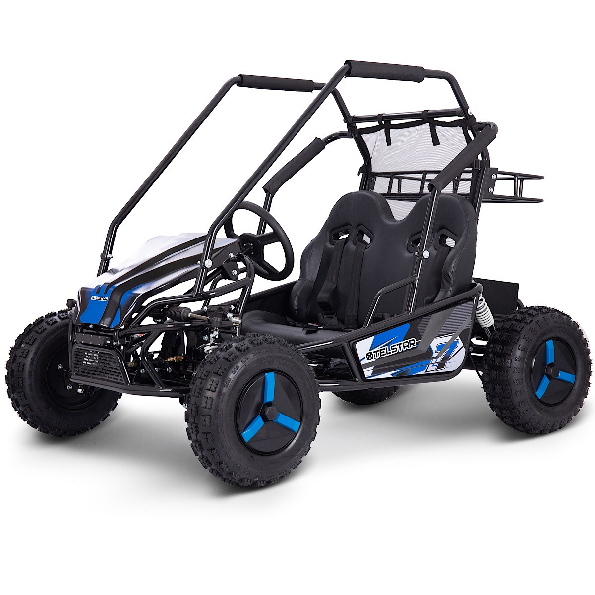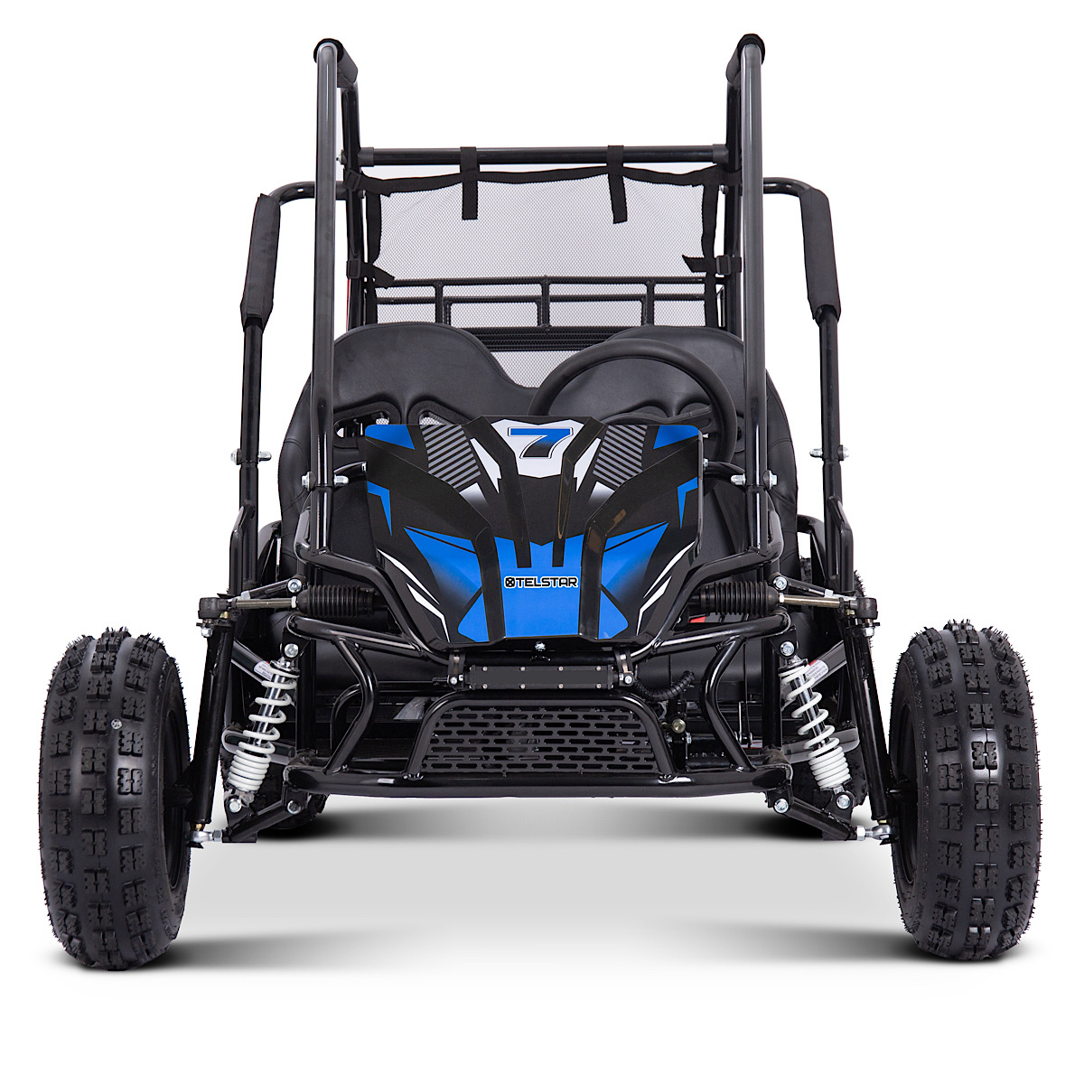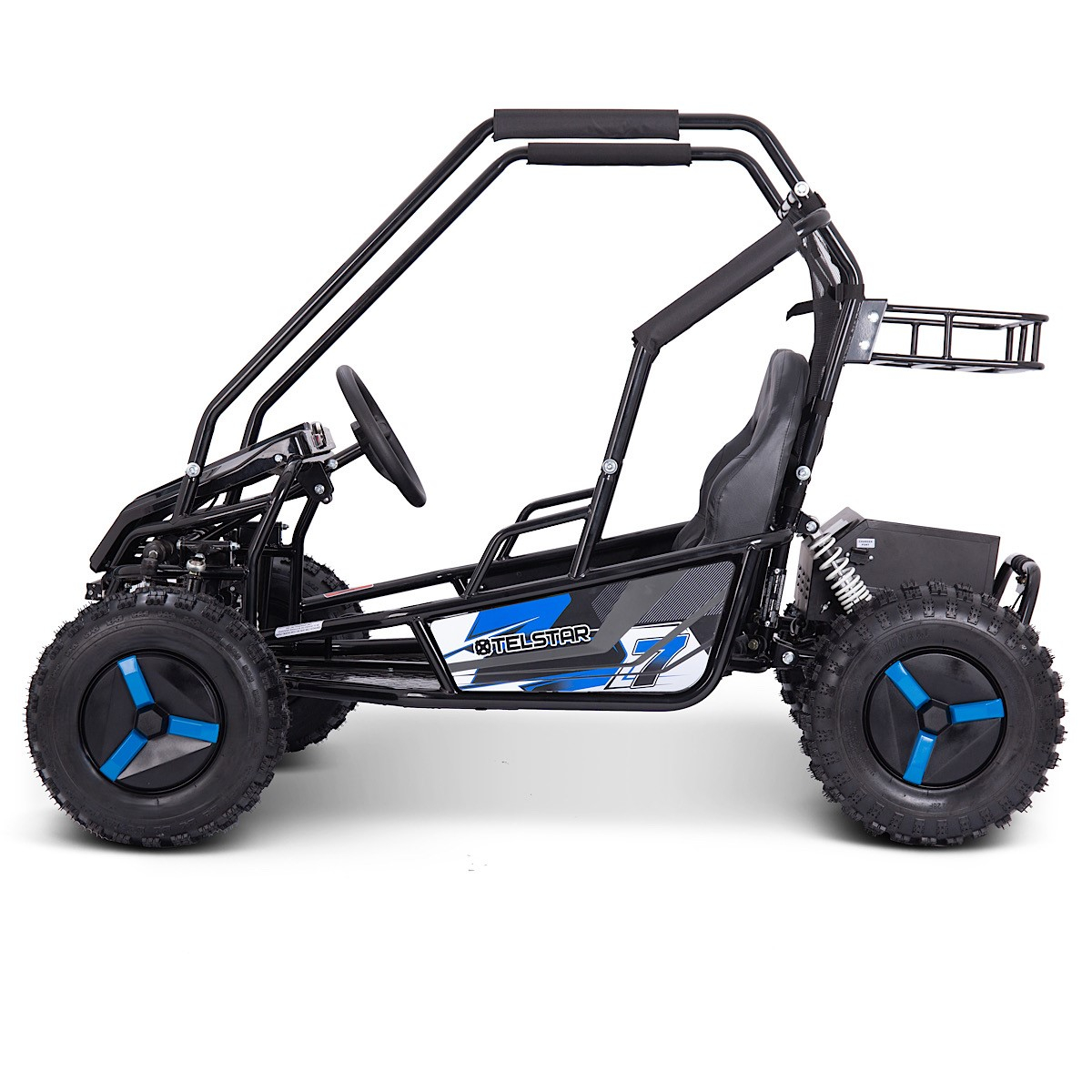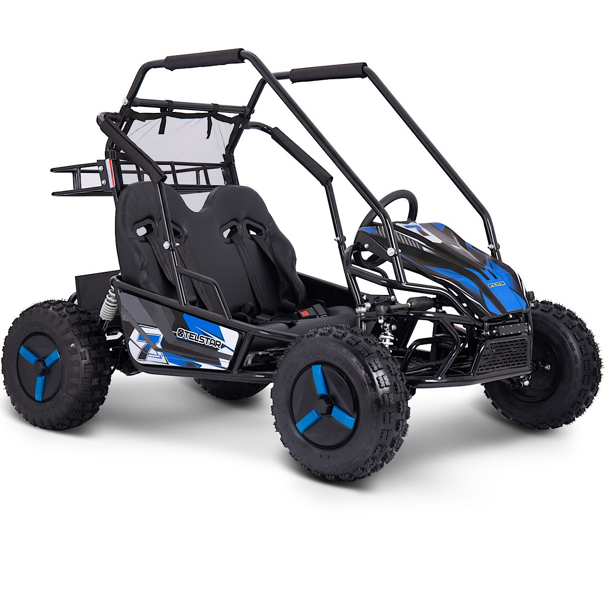 TelStar Kart-15 60V е мощно електрическо ATV бъги, създадено за офроуд приключения и максимално удоволствие от карането. С подсилена конструкция, хидравлично окачване и стабилни офроуд гуми, това бъги предлага надеждност и комфорт върху всякакви терени – трева, чакъл, пясък или асфалт. Двойната седалка с предпазни колани и здрава защитна клетка осигуряват безопасност и стабилност при всяко каране.